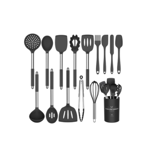 - ✅15 PREMIUM KITCHEN UTENSILS SET: 15 professional silicon Kitchen Utensil set includes slotted turner, solid turner, deep soup ladle, pasta server, flexible spatula, spoon spatula, spreader spatula, slotted spatula, bating brush, egg whisk, slotted spoon, solid spoon, kitchen tongs and holder. Meet your all kinds of kitchen needs